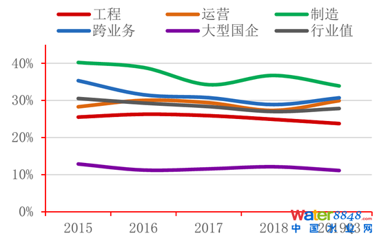 我們從萬德咨詢中選取了94家主營業(yè)務(wù)為水環(huán)境治理的上市公司,按業(yè)務(wù)類型將其劃分為工程、運(yùn)營、制造和縱向綜合四類進(jìn)行財(cái)務(wù)數(shù)據(jù)分析;此外,由于近年來中國建筑(5.330, 0.14, 2.70%)、中國交建(8.390, 0.24, 2.94%)、中國鐵建(9.730, 0.36, 3.84%)、中國鐵工、中國電建、中國能建、中國冶金、中國化學(xué)(5.930, 0.03, 0.51%)等8家大型基建國企不斷拓展水處理相關(guān)業(yè)務(wù),且占據(jù)較大市場份額,故此也將對該類企業(yè)與傳統(tǒng)水環(huán)境治理行業(yè)公司在財(cái)務(wù)表現(xiàn)上的差異進(jìn)行對比分析。通過對比我們發(fā)現(xiàn)水環(huán)境治理行業(yè)存在以下特點(diǎn):