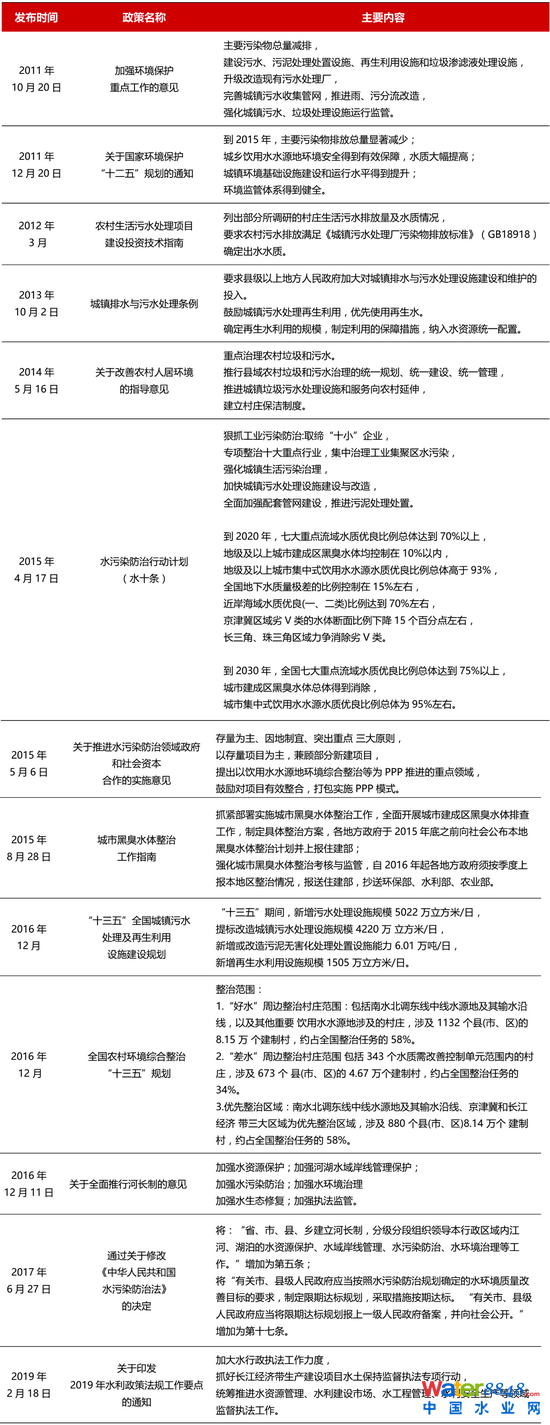 為實(shí)現(xiàn)水環(huán)境的標(biāo)本兼治,自2015年以來,我國先后出臺(tái)了《農(nóng)村生活污水處理項(xiàng)目建設(shè)投資技術(shù)指南》《城鎮(zhèn)排水與污水處理?xiàng)l例》《水污染防治行動(dòng)計(jì)劃 》《“十三五”全國城鎮(zhèn)污水處理及再生利用設(shè)施建設(shè)規(guī)劃》《全國農(nóng)村環(huán)境綜合整治“十三五”規(guī)劃》《中華人民共和國水污染防治法》(修改決定)等十余部政策法規(guī)(完整內(nèi)容見附錄1)。