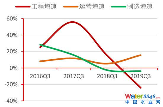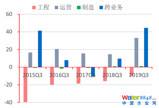 2017年以后行業(yè)整體經(jīng)營性凈現(xiàn)金流有回升趨勢。按業(yè)務(wù)類型看,工程類企業(yè)經(jīng)營性現(xiàn)金流凈額負(fù)值收窄,制造類企業(yè)凈額由負(fù)轉(zhuǎn)正,運(yùn)營、跨業(yè)務(wù)類企業(yè)2019年第三季度有大幅提升,主要原因在于分別受上海公用、碧水源兩大龍頭企業(yè)的大量經(jīng)營性現(xiàn)金流入影響。