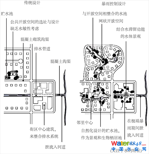 新型城市水循環(huán)的開發(fā)思路給城市設計帶來了改變。以公共開發(fā)空間為例,圖2比較了暴雨控制設計與傳統設計截然不同的設計思路。在傳統設計中,建筑是工整地排列,雨水和污水是通過集中官網,收集處理。而在暴雨控制設計中,引入了與開放空間相整合的水池,鄰里中心等多種景觀,水系環(huán)流整個街區(qū)。據此可以總結出暴雨控制設計的五個特點 [16] :保證受納水體水質;減少徑流和峰值流量,通過合理布置下滲池、透水鋪裝等措施降低下游流量峰值;保護天然水系,在城市發(fā)展過程中使其充分發(fā)揮作用;最小化排水設施的成本,在減少城市發(fā)展成本的同時增加效益,并使景觀得到改善,從而提升區(qū)域價值;將暴雨處理手段整合進景觀,將雨水作為一種景觀要素。在暴雨控制設計中,水是關鍵,要綜合考慮水質、水量、水系、水處理設計和親水景觀。