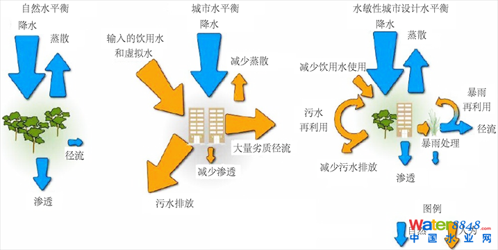 不同種類的暴雨徑流控制體系協調的都是人類活動與城市自然的水文循環(huán)過程之間的關系。在這些控制體系的指導下,城市水循環(huán)也被賦予了新的內容。以水敏性城市設計WSUD為例,圖1比較了城市水循環(huán)的不同開發(fā)思路。圖中藍色箭頭代表自然過程,而黃色箭頭則是人為過程。將水敏性城市設計水平衡與城市水平衡做一個比較,可以發(fā)現水敏性城市設計水平衡增加了蒸發(fā)、滲透、徑流這三種自然過程,減少了飲用水的使用和污水的排放,回用了暴雨和污水。該設計思路總體上改善了自然徑流過程,減少了人為徑流。