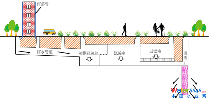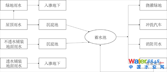 新建城區(qū)的示范工程位于雙紫園小區(qū)內,其雨洪利用工藝流程如圖4,通過對屋頂雨水的引流和透水/不透水地面鋪裝,實現雨水的回收利用。