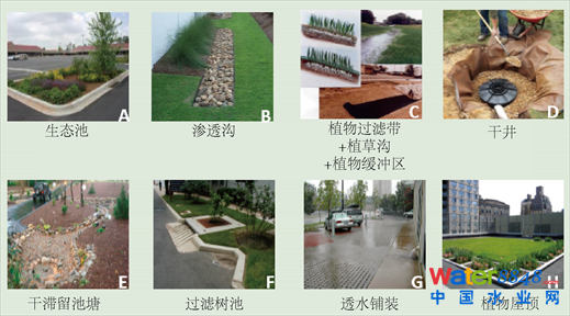 盡管不同國家都發(fā)展出各具特色的暴雨徑流控制體系,但其中的技術措施基本一致。本文具體以低影響開發(fā)LID來闡述暴雨徑流的技術措施。LID以不增加城市基礎設施負擔為原則,通過分散的、小規(guī)模的源頭控制,綜合采用入滲、過濾、蒸發(fā)等方式減少徑流排水量,減少下游排水管道的尺寸,恢復區(qū)域的自然水文功能,補充地下水 [11],圖3列出了常見的LID技術示范。