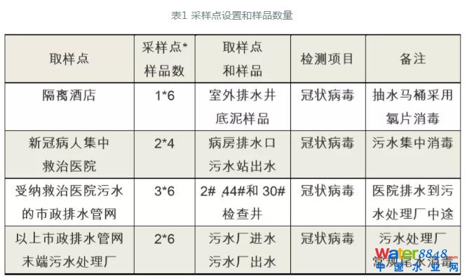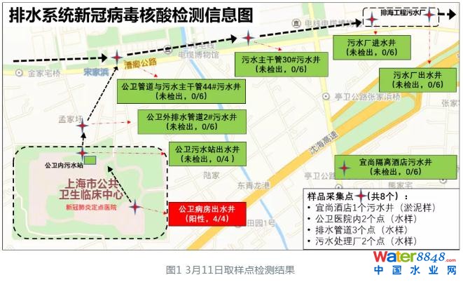 徐祖信院士團(tuán)隊(duì)在上海公共衛(wèi)生臨床中心等相關(guān)單位鼎力支持下,選擇上海市定點(diǎn)隔離酒店、新冠肺炎患者定點(diǎn)醫(yī)院的排水輸送管道以及末端的城市污水處理廠,于2020年3月11日進(jìn)行了采樣,包括病房、消毒設(shè)施、市政管網(wǎng)、污水處理廠四個(gè)場景。新冠病人集中救治醫(yī)院在病房排水口、污水消毒站排水口取樣,每個(gè)點(diǎn)取4個(gè)樣;疑似病人隔離酒店在污水排入酒店外的集水井中取樣,一共6個(gè)樣品;市政污水管網(wǎng)在沿線檢查井中取樣,每個(gè)點(diǎn)取6個(gè)樣;污水處理廠在進(jìn)水和尾水處采樣,每個(gè)采樣點(diǎn)取6個(gè)樣品。一共44個(gè)樣品,如表1和圖1所示。