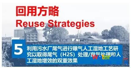 第五個是利用污水處理廠尾氣進行曝氣人工濕地研究。污水處理廠產(chǎn)生臭氣,把這些臭氣進行收集,收集后用作鋁污泥型人工濕地的曝氣氣源。我們研究很多,把收集的污水處理廠臭氣從底部通入鋁污泥型人工濕地系統(tǒng),鋁污泥可以吸附臭氣中的硫化氫,同時給濕地做一點鼓氣作用,促進濕地效果,同時除臭,一舉兩得。