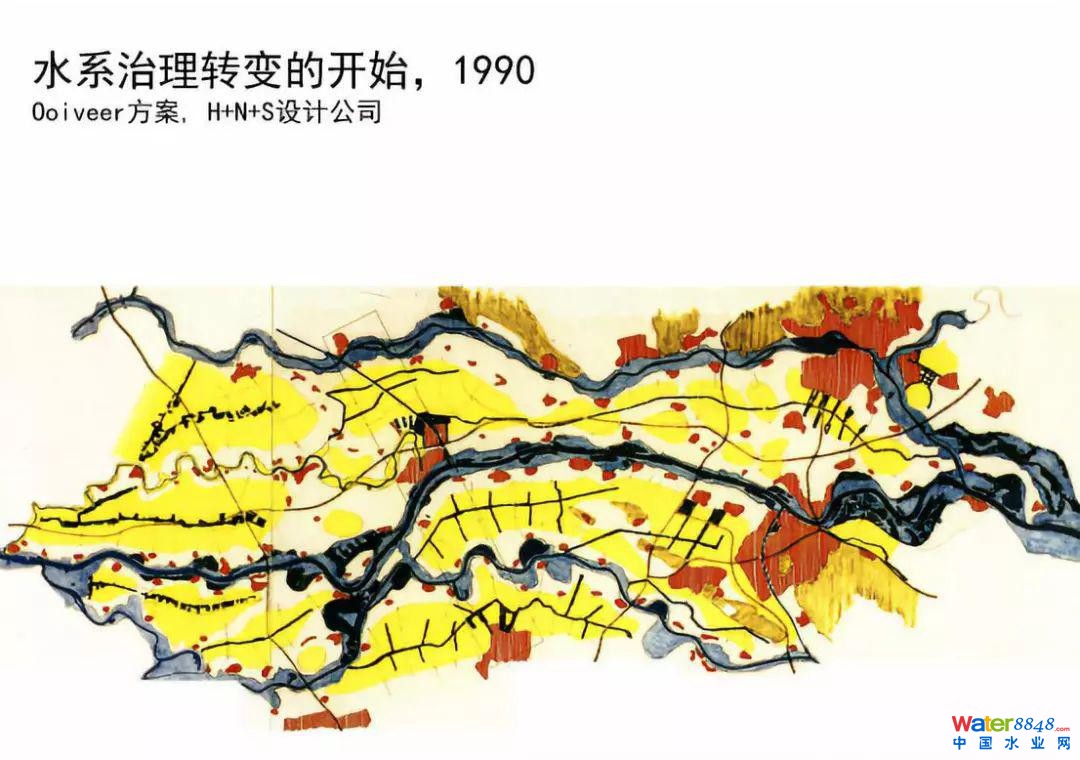 大家也應(yīng)該熟悉這些經(jīng)典的水利工程,包括須德海大壩、三角洲工程等。上世紀(jì)九十年代之前荷蘭的水系治理更多的是一個(gè)單一防洪工程主導(dǎo)的思路,1990年荷蘭政府組織了一個(gè)競(jìng)賽,在提交的Ooiveer方案中H+N+S公司憑借萊茵河水系治理的新思路贏得了競(jìng)標(biāo)。 這個(gè)方案很好的一點(diǎn)就是把萊茵河兩岸的這樣一個(gè)傳統(tǒng)已經(jīng)被農(nóng)業(yè)用途侵占的河漫灘的的區(qū)域恢復(fù)成自然,其中包括了四個(gè)必備的元素,林灌地、洪泛濕地、水塘、野生動(dòng)物,并依靠在此基礎(chǔ)上構(gòu)建的管理框架成為后續(xù)流域發(fā)展的彈性基礎(chǔ)。