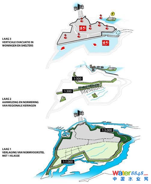 由于意識(shí)到難以“絕對(duì)”避免水災(zāi),荷蘭防洪相關(guān)的研究及建設(shè)中,按照災(zāi)前預(yù)防與災(zāi)后止損并重的思路,強(qiáng)調(diào)多層防護(hù)設(shè)計(jì)(Multiple Layers of Safety),具體可以分解為預(yù)防措施、保護(hù)措施以及應(yīng)急措施三個(gè)層次。