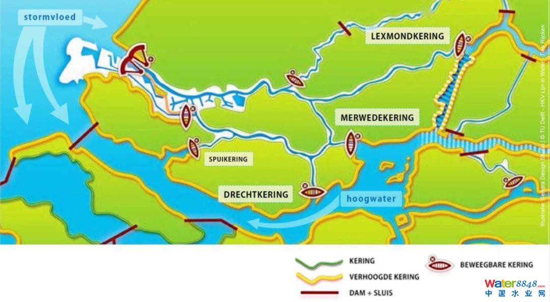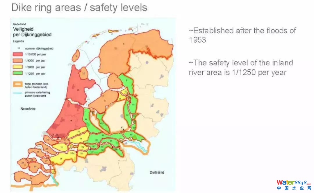荷蘭長(zhǎng)期以來(lái)的水災(zāi)水患比較多。1953年堤防決口,造成很多城鎮(zhèn)被淹。從那以后就建立了一個(gè)非常發(fā)達(dá)的防洪圈系統(tǒng)。防洪的標(biāo)準(zhǔn)也比較高,最低的話也是1250年一遇的防洪標(biāo)準(zhǔn),到阿姆斯特丹等重要城市甚至達(dá)到1萬(wàn)年一遇的標(biāo)準(zhǔn)。