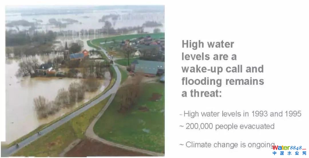 1993-1995年,萊茵河流域的洪水來(lái)的比往年更大一些。因暴雨、融雪增加等影響,萊茵河及其支流水位高漲,沿線法國(guó)、德國(guó)、荷蘭均有潰堤情況發(fā)生。荷蘭人意識(shí)到防洪面臨著新挑戰(zhàn),傳統(tǒng)加高堤防的做法也不能保證絕對(duì)安全。