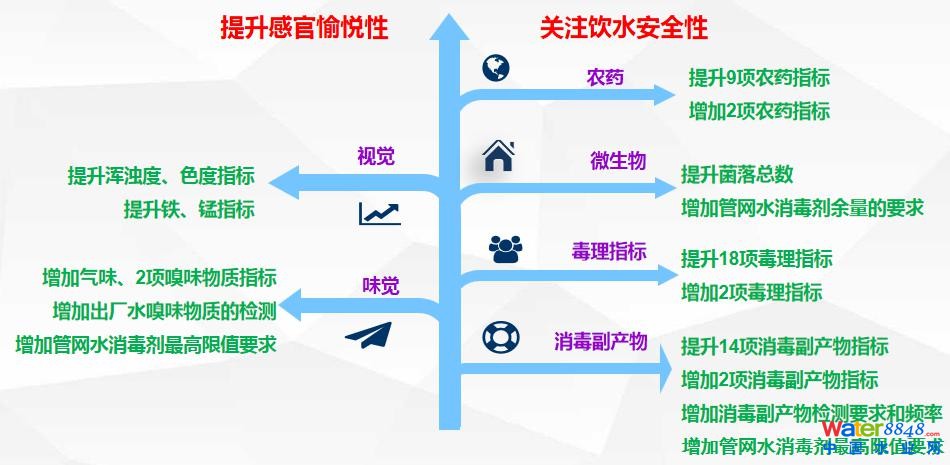 深圳市《生活飲用水水質(zhì)標(biāo)準(zhǔn)》與國(guó)家現(xiàn)行標(biāo)準(zhǔn)相比,增加了10項(xiàng)指標(biāo),提升了52項(xiàng)指標(biāo)(含消毒劑);附錄由原來的28項(xiàng)增加到45項(xiàng);考核方法上提升了出廠水和管網(wǎng)水合格率要求,增加了嗅味物質(zhì)和消毒副產(chǎn)物的檢測(cè),重點(diǎn)關(guān)注龍頭水水質(zhì)。