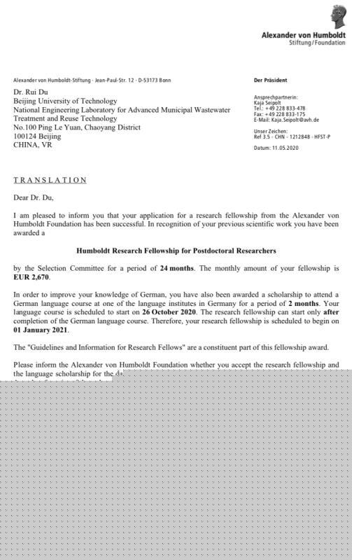 近日,我校環(huán)境與生命學(xué)部師資博士后杜睿博士收到德國(guó)洪堡基金會(huì)(Alexander von Humboldt Foundation)獲得2021年德國(guó)“洪堡學(xué)者”計(jì)劃資助的通知(見圖片),將于明年赴德國(guó)開展合作研究。杜睿博士成為北京工業(yè)大學(xué)培養(yǎng)的首位獲得該榮譽(yù)稱號(hào)的博士和博士后。