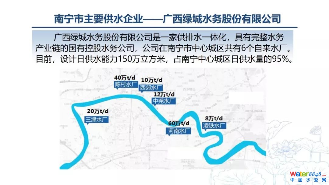 城市供水水源布局是影響城市總體布局、城市重大工程項目選址、城市可持續(xù)發(fā)展戰(zhàn)略的關(guān)鍵,也是合理開發(fā)利用、科學(xué)管理和有效保護城市水資源的需要。所以,合理布局城市供水水源系統(tǒng),做到保障水源供水安全,建立并健全城市供水水源系統(tǒng)是每個城市供水企業(yè)必須解決的問題。廣西綠城水務(wù)股份有限公司貝德光總工在《中國給水排水》第七屆飲用水安全保障技術(shù)交流會上分享了報告《典型南方豐水城市的水源布局與思考——以南寧市為例》,結(jié)合南方城市水源特點及南寧市的實際情況,提出以兩江作為主水源、水庫水作為輔助水源及應(yīng)急備用水源的城市供水水源布局。通過建立南寧市城市供水多水源系統(tǒng),向南方豐水城市提出以多重水源為本、聯(lián)合調(diào)度為輔的布局理念,該水源布局系統(tǒng)可有效保護城市供水水源的安全,讓城市供水企業(yè)找到適合南方豐水城市多水源供水的有效途徑。最后對南寧市城市水源布局提出了一些具有共性的思考和建議,誠邀其他城市供水企業(yè)一起討論,共同進(jìn)步。