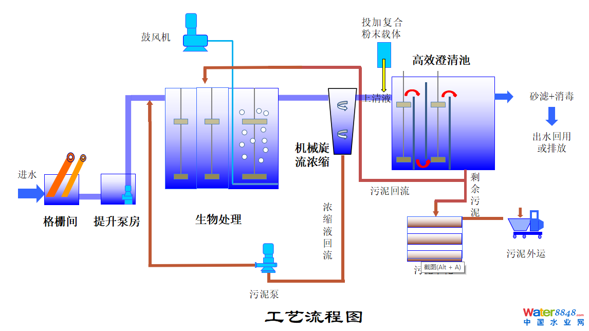 HPB系統(tǒng)向常規(guī)活性污泥法除磷脫氮工藝中導(dǎo)入復(fù)合粉末載體,復(fù)合粉末載體的導(dǎo)入延長了污泥泥齡,提高了系統(tǒng)污泥濃度,達(dá)到15~20 g/L,為適合附著生長的硝化菌和反硝化菌等微生物提供了適宜的生存生長環(huán)境,使脫氮菌的數(shù)量提高,脫氮能力得到有效強(qiáng)化。該系統(tǒng)在生物除磷的基礎(chǔ)上,通過加藥實(shí)現(xiàn)對出水總磷的穩(wěn)定控制,實(shí)現(xiàn)高濃度污泥混合液的高效分離并使除磷脫氮生物處理系統(tǒng)保持高濃度污泥混合液的狀態(tài)。系統(tǒng)利用機(jī)械旋流濃縮器對混合液進(jìn)行濃縮,濃縮液回流至缺氧池,上清液則進(jìn)入高效澄清池。在高效澄清池內(nèi)進(jìn)行加藥分離,出水通過砂濾進(jìn)一步對出水中的懸浮物進(jìn)行穩(wěn)定而有效的去除,使出水懸浮物穩(wěn)定達(dá)標(biāo)。系統(tǒng)除磷脫氮能力可滿足國家日趨嚴(yán)格的排放水限值要求。