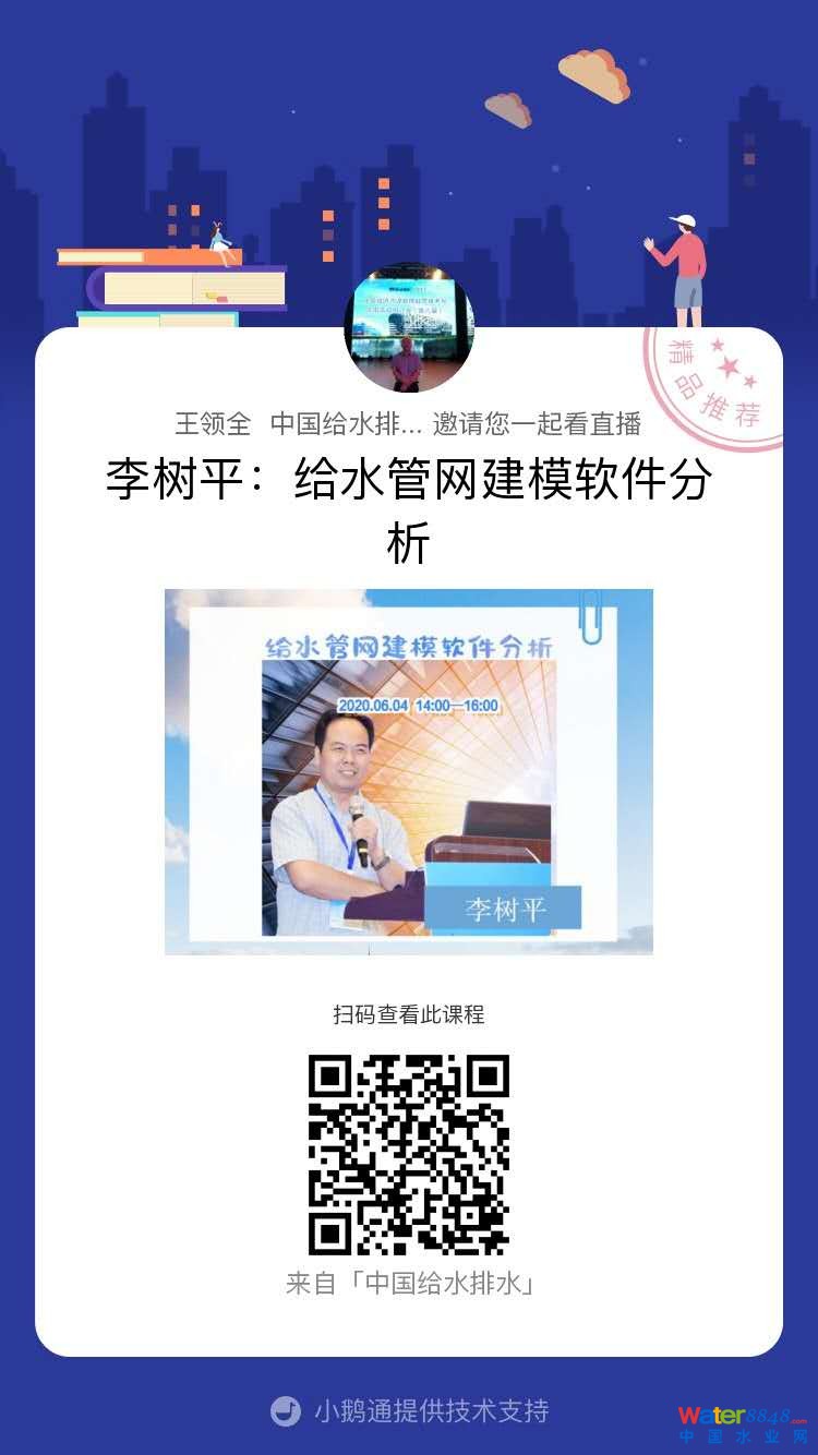 @所有人:感謝北京清源華建環(huán)境科技有限公司 陳亮  總工程師、西班牙科學(xué)院智能控制研究所博士后研究員  孫聰聰 工學(xué)博士、清華大學(xué) 環(huán)境學(xué)院 賈海峰 教授/博導(dǎo)、上海城建設(shè)計(jì)研究總院 唐建國(guó) 總工,東南大學(xué) 呂錫武 教授/博導(dǎo) ,華北設(shè)計(jì)研究總院城市環(huán)境院 孫永利 院長(zhǎng),智慧水務(wù)分院 王浩正 院長(zhǎng),蘇伊士 程忠紅 經(jīng)理,華博水務(wù) 曹仲宏 總經(jīng)理,上海市水務(wù)規(guī)劃設(shè)計(jì)研究院 副總工、中關(guān)村科技租賃 大環(huán)境事業(yè)部 高級(jí)項(xiàng)目經(jīng)理 王川川 等嘉賓 的精彩演講 !現(xiàn)在大家可以觀看直播回放了(進(jìn)入 中國(guó)給水排水微信公眾號(hào) cnww1985,首頁(yè)右下角 云直播 ,即可看直播和 直播回放)。    本周四(6月4日)下午14:00-16:00,題目:給水管網(wǎng)建模軟件分析,時(shí)間:2020年 6月4日,主講人:李樹(shù)平,工學(xué)博士,系統(tǒng)分析員,同濟(jì)環(huán)境科學(xué)與工程學(xué)院 副教授  。凡是直播結(jié)束前 轉(zhuǎn)發(fā)邀請(qǐng)成功其他同事和朋友觀看直播的網(wǎng)友們, 我們特贈(zèng)送2019年雨水或者污泥大會(huì)論文集一本。有需要的朋友可以和孫磊(中國(guó)給水排水雜志社孫磊,微信號(hào)suelay001)聯(lián)系。