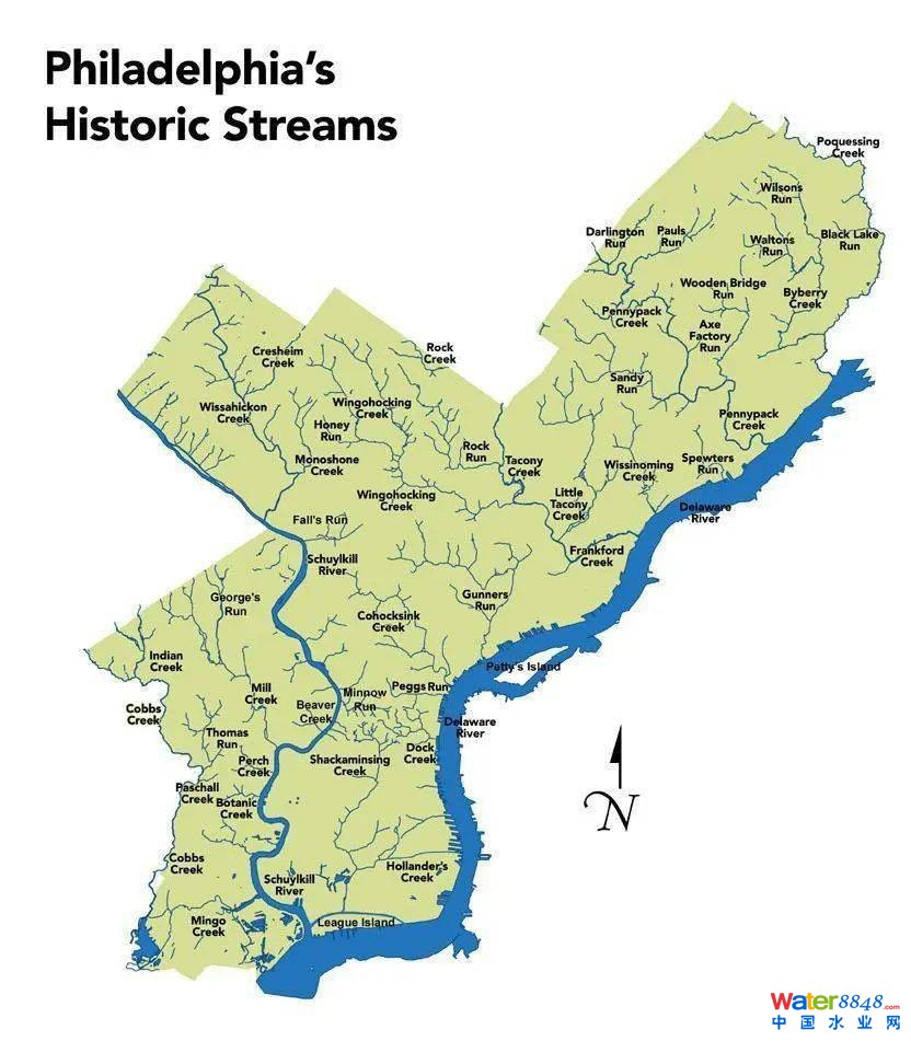 費(fèi)城是美國(guó)最老、最具歷史意義的城市之一。城市化發(fā)展所帶來(lái)的一系列問(wèn)題在費(fèi)城也很明顯存在。不透水面積增加,自然水體消失退化。同時(shí)雨污合流的溢流(Combined sewer overflow),河流改變和侵蝕(Hydromodification/erosion),洪澇災(zāi)害(Flooding), 水質(zhì)惡化(Water quality)等問(wèn)題都不同程度存在于費(fèi)城的四條主要河流中。