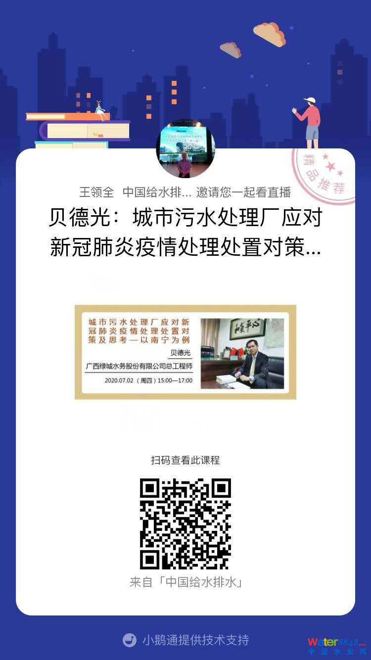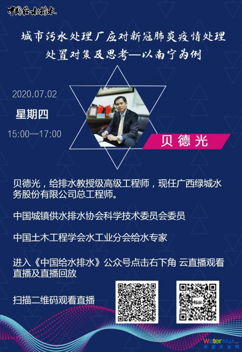 今天我們很榮幸地邀請(qǐng)到了 貝德光 總工:貝德光 總工的 直播題目為:城市污水處理廠應(yīng)對(duì)新冠肺炎疫情處理處置對(duì)策及思考——以南寧為例