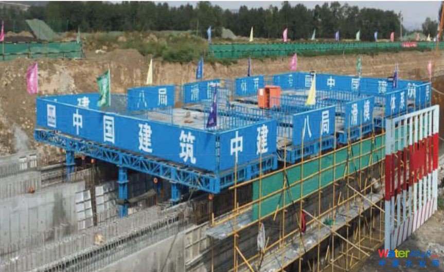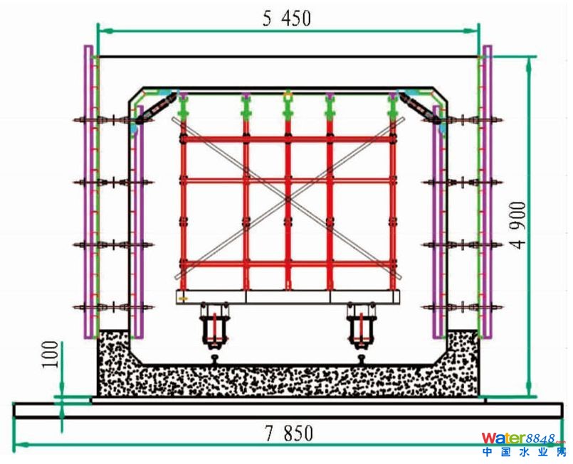 目前,國內(nèi)已經(jīng)出現(xiàn)了多種型式的模板滑移技術(shù),例如:三亞海榆東路、鄭州濱河新城的單艙滑模,十堰市的多艙滑移臺(tái)車等。其中,中建八局施工的西寧管廊項(xiàng)目自主研發(fā)了一套整體移動(dòng)模板臺(tái)架(見圖2),在西寧2條路的管廊項(xiàng)目和西安PPPⅠ標(biāo)項(xiàng)目得到了成功應(yīng)用,經(jīng)詳細(xì)測(cè)算,移動(dòng)模架體系施工成本比傳統(tǒng)木模施工降低約37.69元/m³。