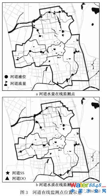 在水量監(jiān)測(cè)方面,各河道源頭均位于試點(diǎn)區(qū)內(nèi),在距源頭200m左右的位置進(jìn)行液位在線監(jiān)測(cè),沿途中間段布設(shè)液位計(jì)以監(jiān)測(cè)水位變化;試點(diǎn)區(qū)出口及支流匯入處布設(shè)流量監(jiān)測(cè)。水質(zhì)監(jiān)測(cè)方面,為對(duì)流經(jīng)試點(diǎn)區(qū)部分進(jìn)行水環(huán)境質(zhì)量的綜合評(píng)價(jià),在每條河道試點(diǎn)區(qū)范圍內(nèi)上下游各布置1臺(tái)在線SS監(jiān)測(cè)儀,河道中下游位置布設(shè)在線DO監(jiān)測(cè)儀,對(duì)河道整體的黑臭情況進(jìn)行反映。河道在線監(jiān)測(cè)布點(diǎn)如圖3所示。