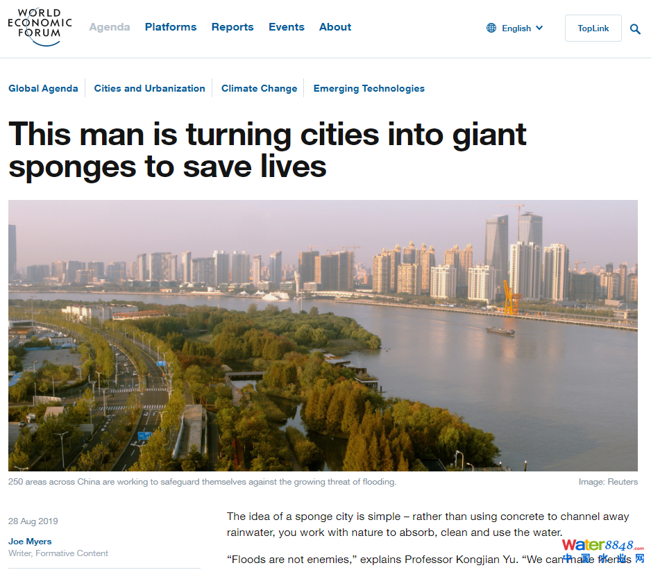日前,世界經(jīng)濟(jì)論壇網(wǎng)站“城市與城鎮(zhèn)化”板塊聚焦中國(guó)海綿城市建設(shè),報(bào)道了北京大學(xué)教授俞孔堅(jiān)關(guān)于海綿城市的學(xué)術(shù)、設(shè)計(jì)思想及主要實(shí)踐成就。