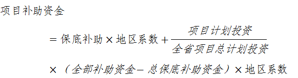 3.資金分配。項(xiàng)目全部補(bǔ)助資金為29133萬(wàn),項(xiàng)目補(bǔ)助資金以項(xiàng)目計(jì)劃投資為分配因素,按因素法進(jìn)行分配,單個(gè)項(xiàng)目補(bǔ)助資金按照以下公式進(jìn)行計(jì)算: