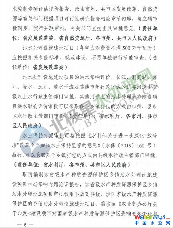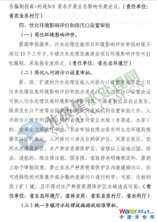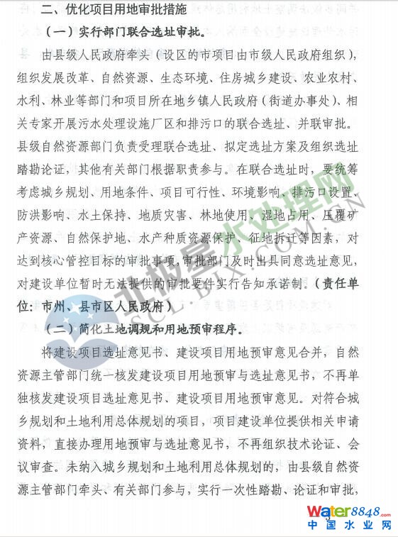 《通知》要求,抓好污水處理設施建設前期工作,實施“省級指導、市州統(tǒng)籌、縣市區(qū)落實”。項目審批權限按照屬地原則下放到市州、縣市區(qū),涉及鄉(xiāng)鎮(zhèn)項目的下放到縣級;評估評價論證報告能取消的,應該取消;實行聯(lián)合選址、并聯(lián)審批;審查審核審批時限縮短一半。