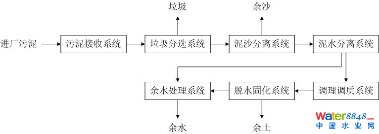 該規(guī)范所稱污泥處理工藝是在機(jī)械脫水固結(jié)的基礎(chǔ)上進(jìn)行了完善:加強(qiáng)前置預(yù)處理,實(shí)現(xiàn)逐步減量并進(jìn)行資源化再生;機(jī)械脫水固結(jié)重視過程環(huán)保和循環(huán)利用;重視后端水的處理,使回排水水質(zhì)明顯優(yōu)于原水,使水環(huán)境治理工程本身也能做到節(jié)能環(huán)保、循環(huán)利用、資源再生,同時(shí)也降低了后續(xù)的處置難度。工藝主要包含污泥接收系統(tǒng)、垃圾分選系統(tǒng)、泥沙分離系統(tǒng)、泥水分離系統(tǒng)、調(diào)理調(diào)質(zhì)系統(tǒng)、脫水固化系統(tǒng)、余水處理系統(tǒng)七大系統(tǒng),產(chǎn)生垃圾、余沙、余土和余水四種產(chǎn)出物,如圖1所示。