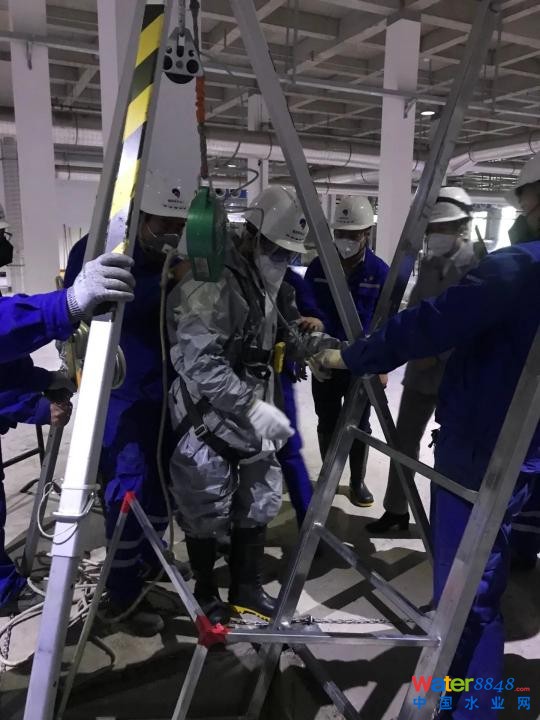 操作人員佩戴正壓式空氣呼吸器,在監(jiān)護(hù)人員輔助下,準(zhǔn)備下井清理淤泥。王領(lǐng)獎(jiǎng)攝