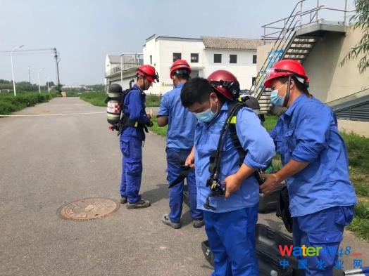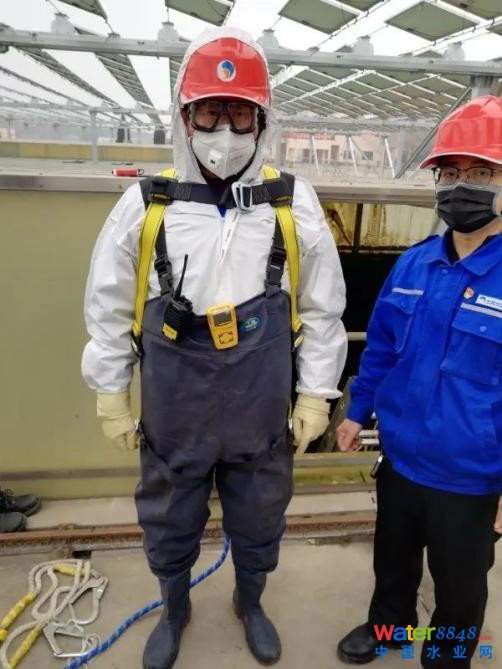 操作人員頭戴安全帽,身穿防護(hù)服,佩戴正壓式空氣呼吸器,在監(jiān)護(hù)人員輔助下,準(zhǔn)備檢查生物池曝氣盤。劉瑛良攝