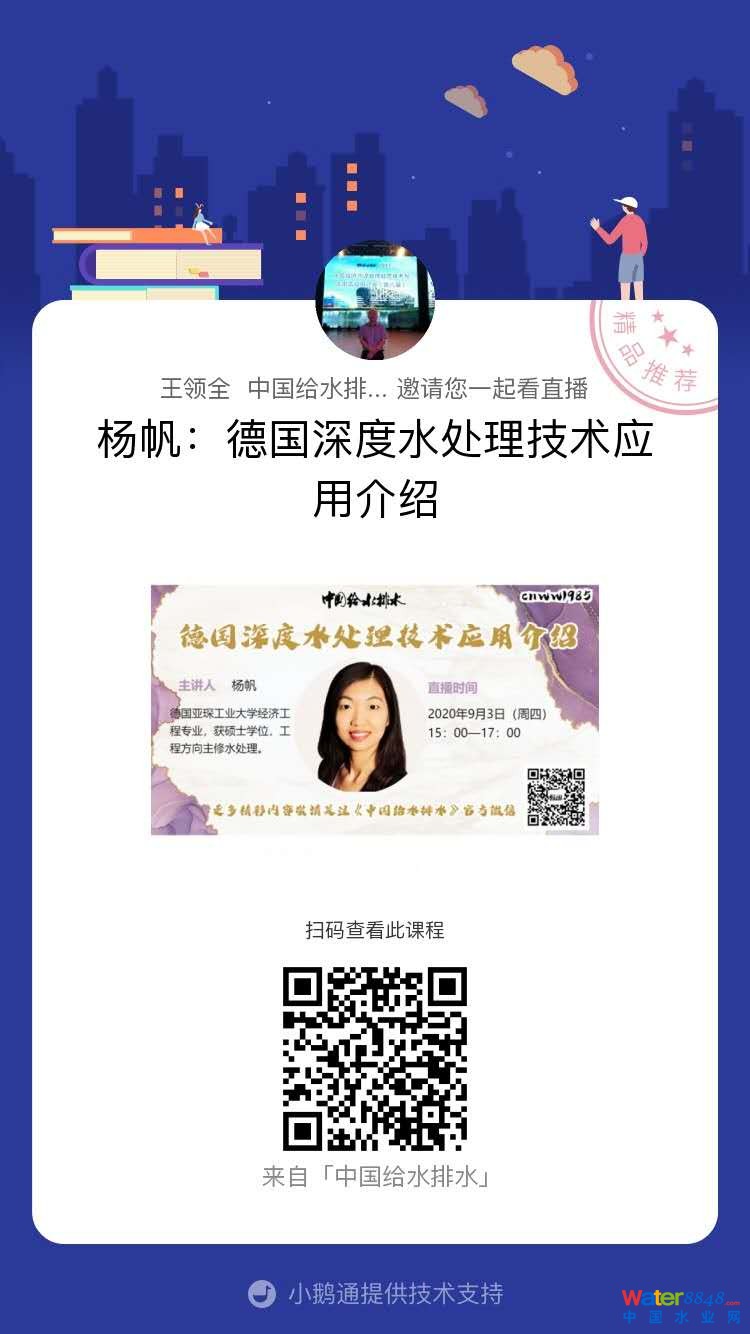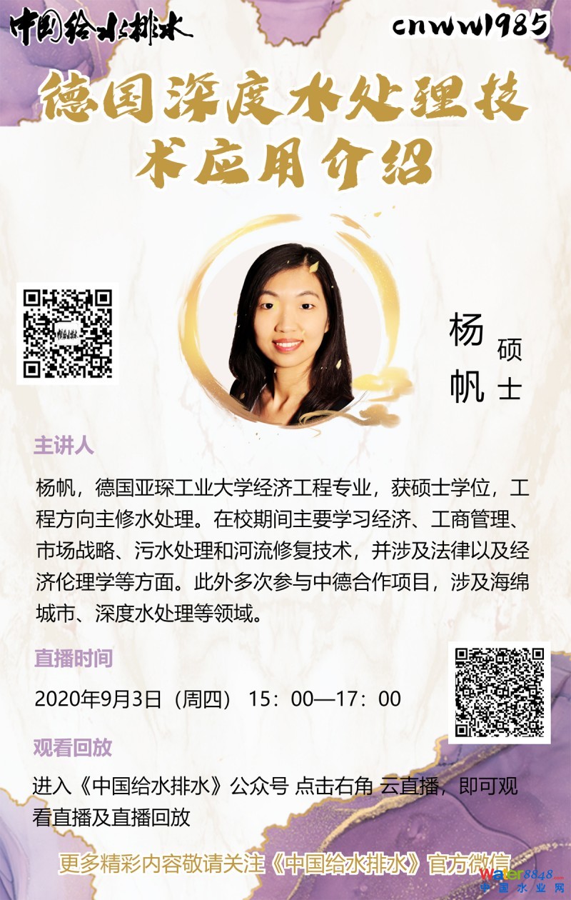 言歸正傳,下面進入直播主題: 今天我們很榮幸地邀請到了 楊帆 碩士:楊帆 碩士 的直播題目為:德國深度水處理技術應用介紹