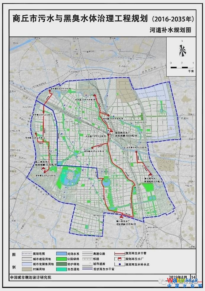 規(guī)劃遠(yuǎn)期商丘市中心城區(qū)再生水量為55萬立方米/日,再生水的工業(yè)用水需求量7.1萬立方米/日,市政澆灑用水需求量10.2萬立方米/日,剩余的再生水全部用于河道生態(tài)補(bǔ)水,可提供補(bǔ)水量37.7萬立方米/日。