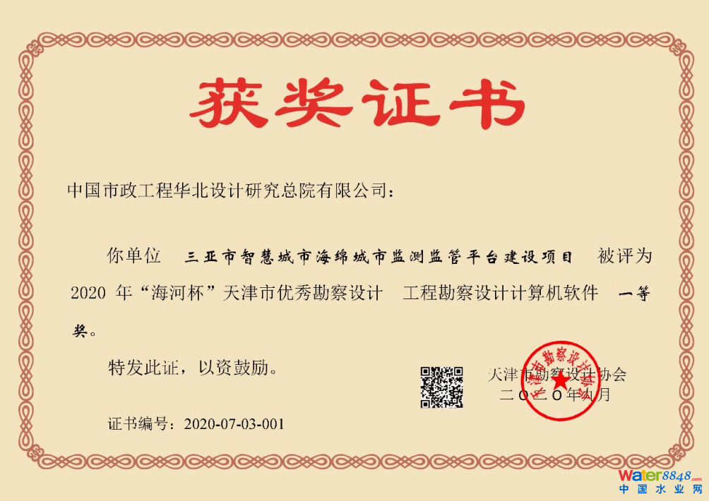 由華北院承擔(dān)的三亞市智慧城市海綿城市監(jiān)測(cè)監(jiān)管平臺(tái)建設(shè)項(xiàng)目榮獲2020年“海河杯”一等獎(jiǎng)