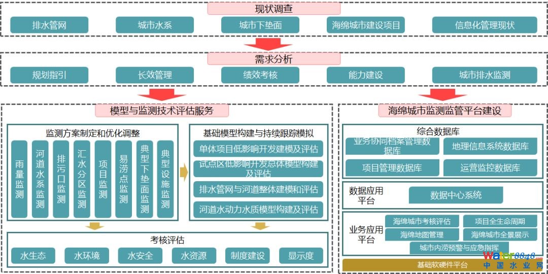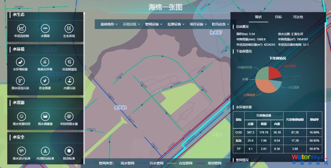 本項(xiàng)目以“2個(gè)平臺(tái)——1個(gè)中心+5個(gè)應(yīng)用系統(tǒng)”的構(gòu)架思路,建立了一整套可評(píng)估、可追溯的海綿城市一體化管控平臺(tái),結(jié)合地理信息技術(shù)、在線監(jiān)測(cè)技術(shù)和TMDL思路,實(shí)現(xiàn)了三亞市海綿城市從規(guī)劃、設(shè)計(jì)、施工到運(yùn)營的全生命周期智慧化評(píng)估和管控。