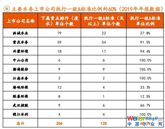 污水處理廠提標改造需求帶來廣闊市場空間。雖然我國污水處理率已處于較高水平,但出水水質還有待提升。隨著我國對環(huán)境保護的要求不斷提高,越來越多的污水廠排放標準由原來的《城鎮(zhèn)污水處理廠污染物排放標準》(GB18918-2002)中的二級、一級 B 標準提升為一級 A 或者更高標準,污水處理廠提標改造迫在眉睫。截止2019年底,我們統(tǒng)計主要上市公司一級A標準執(zhí)行率約60%,提標改造空間較大。