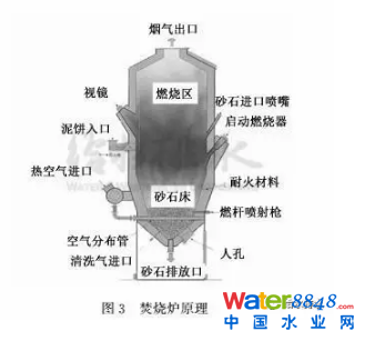焚燒爐是整個工程的核心。本工程設置2臺鼓泡流化床焚燒爐,每臺焚燒爐直徑7.3m(外徑),高度14.8m,立式圓柱鋼殼體,內(nèi)有耐火材料及保溫材料襯里,外設保溫夾套,每臺焚燒爐額定熱負荷12.35MW。焚燒爐自下而上依次為錐底、流化區(qū)、自由燃燒區(qū)。焚燒爐布風采用布風管形式,設于砂床下部,布風管向下開孔,通過焚燒爐錐形底部的反射作用將砂床流化。每臺焚燒爐床層上部設置兩套啟動燃燒器用于焚燒爐啟動時升溫,每套負荷12000MJ/h,使用輕柴油作為燃料;底部設有輔助燃燒系統(tǒng),每臺焚燒爐設8個噴油槍,用于運行中爐溫的調(diào)節(jié)。焚燒爐頂部設有冷卻水噴槍和噴尿素系統(tǒng),用于防止焚燒爐超溫和減少氮氧化物產(chǎn)生。焚燒爐原理見圖3。