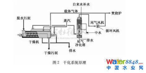 在干化機空心軸、槳葉和夾套中通入0.5~0.8MPa飽和蒸汽,濕污泥從干化機一端進入,在干化機內(nèi)以推流形式緩慢前進并逐漸被干化和破碎,最后半干污泥從另一端排出。干化機內(nèi)通過循環(huán)載氣(空氣)將機內(nèi)水分快速帶走,同時保證干化機內(nèi)部處于微負壓狀態(tài)。排出的濕載氣溫度在85~90℃,經(jīng)過洗滌塔洗滌降溫至40~50℃并脫除水分后,80%送回干化機循環(huán)使用,剩余20%送入焚燒爐作為焚燒二次風,同時載氣中有機成分被高溫分解脫除臭味。采用直接洗滌方式,洗滌水采用污水處理廠處理尾水,冷凝液排放至污水池后經(jīng)提升返回污水處理廠處理。干化系統(tǒng)流程見圖2。