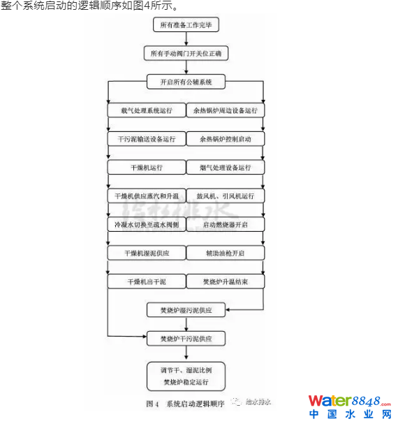 首先根據(jù)工藝要求檢查所有手動閥門是否處于正確的啟閉位置。然后啟動各項公輔系統(tǒng),包括壓縮空氣系統(tǒng)、中水供應系統(tǒng)、自來水供水系統(tǒng)、冷卻水循環(huán)系統(tǒng)、堿液系統(tǒng)、灰輸送系統(tǒng)、砂循環(huán)系統(tǒng)、柴油供應系統(tǒng)、除臭系統(tǒng)等,并確認其運行良好。然后分為干化系統(tǒng)和焚燒系統(tǒng)兩條主線同時按順序啟動。干化系統(tǒng)首先啟動干化載氣循環(huán)系統(tǒng),使干化機內(nèi)部維持負壓,然后啟動中水泵供應中水,然后干燥機啟動運轉(zhuǎn),向干化機通入熱蒸汽暖機,然后將蒸汽疏水閥切換至疏水器側(cè),干燥機升溫結(jié)束后開啟干污泥輸送設備,將濕污泥從儲存?zhèn)}送至干化機。焚燒系統(tǒng)首先啟動余熱鍋爐供水系統(tǒng),然后投入余熱鍋爐溫度、壓力、水位等控制,然后煙氣處理系統(tǒng)設備和灰輸送系統(tǒng)設備投運,然后啟動一次風機,然后點燃啟動燃燒器使焚燒爐緩慢均勻升溫,控制每小時溫度上升不超過50℃,當爐膛溫度達到630℃時,緩慢停止啟動燃燒器,開啟焚燒爐底部的輔助燃燒槍,使焚燒爐溫度達到850℃后,首先向爐內(nèi)供應濕污泥,然后再按比例投入干污泥,通過調(diào)整干、濕污泥給料速率和比例控制焚燒爐溫度并逐漸退出輔助燃燒器,直到焚燒爐穩(wěn)定燃燒。需注意的是,在向干化機供應濕污泥前,焚燒爐需完成升溫,以確保干化不凝氣可以在焚燒爐中處理后排放,避免臭氣擴散。
