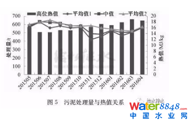 由于竹園一廠污泥量占總進廠量的80%以上,而該廠在2011年完成了污水處理工藝從一級強化升級到二級處理的改造,由此污泥有機質(zhì)含量和熱值較2008~2009年項目設計時有顯著升高。而且同時其他3座廠由于進水水質(zhì)升高等因素,污泥熱值也有相應升高。委托第三方對2015年6月至2016年5月一個完整年度竹園一廠的污泥熱值再次進行了檢測。測得竹園一廠全年24個樣本污泥高位熱值范圍為14.48~18.97MJ/kg,平均值為16.50MJ/kg,較原設計值12.19MJ/kg高出了35%。統(tǒng)計了一年12個月熱值變化和對應的處理量變化趨勢,詳見圖5。