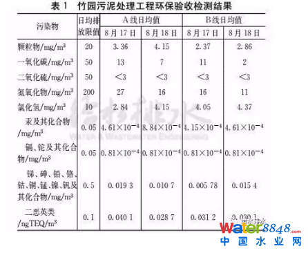 其中,2015年8月17日和18日由第三方檢測機構(gòu)對試運行中的竹園污泥干化焚燒工程進行了為期兩天的環(huán)保驗收檢測,檢測結(jié)果見表1。