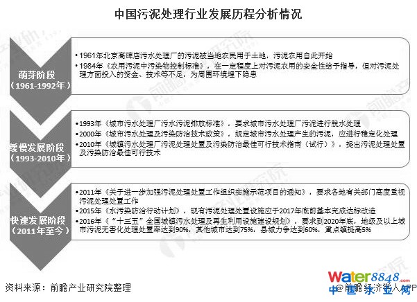 自20世紀(jì)60年代起,中國污泥處理行業(yè)經(jīng)歷了萌芽、緩慢發(fā)展、快速發(fā)展三大階段。1961-1992年,公眾對污泥認(rèn)知度較低,污泥成為環(huán)境污染隱患,污泥處理行業(yè)開始萌芽。