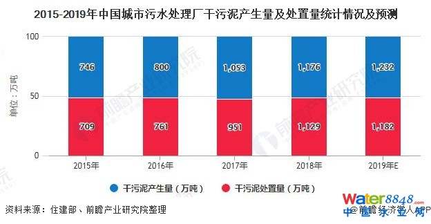 由于城市污水廠污水處理率提高,污泥產(chǎn)生量隨之增加。根據(jù)住建部統(tǒng)計數(shù)據(jù),2018年我國城市污水處理廠干污泥產(chǎn)生量1176萬噸,干污泥處置量為1129萬噸,近年來城市干污泥處置率均在90%以上。前瞻據(jù)2019年城市污水處理廠處理能力增長率估算,2019年中國城市污水處理廠干污泥產(chǎn)生量約為1232萬噸,干污泥處置量約為1182萬噸。