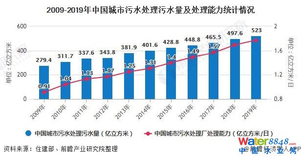由于城鎮(zhèn)化和經(jīng)濟(jì)發(fā)展需求,中國城市近年來污水產(chǎn)生量和處理量呈上升趨勢。從城市污水處理情況來看,截至2019年底,全國城市污水處理廠處理能力1.77億立方米/日,累計處理污水量532億立方米。