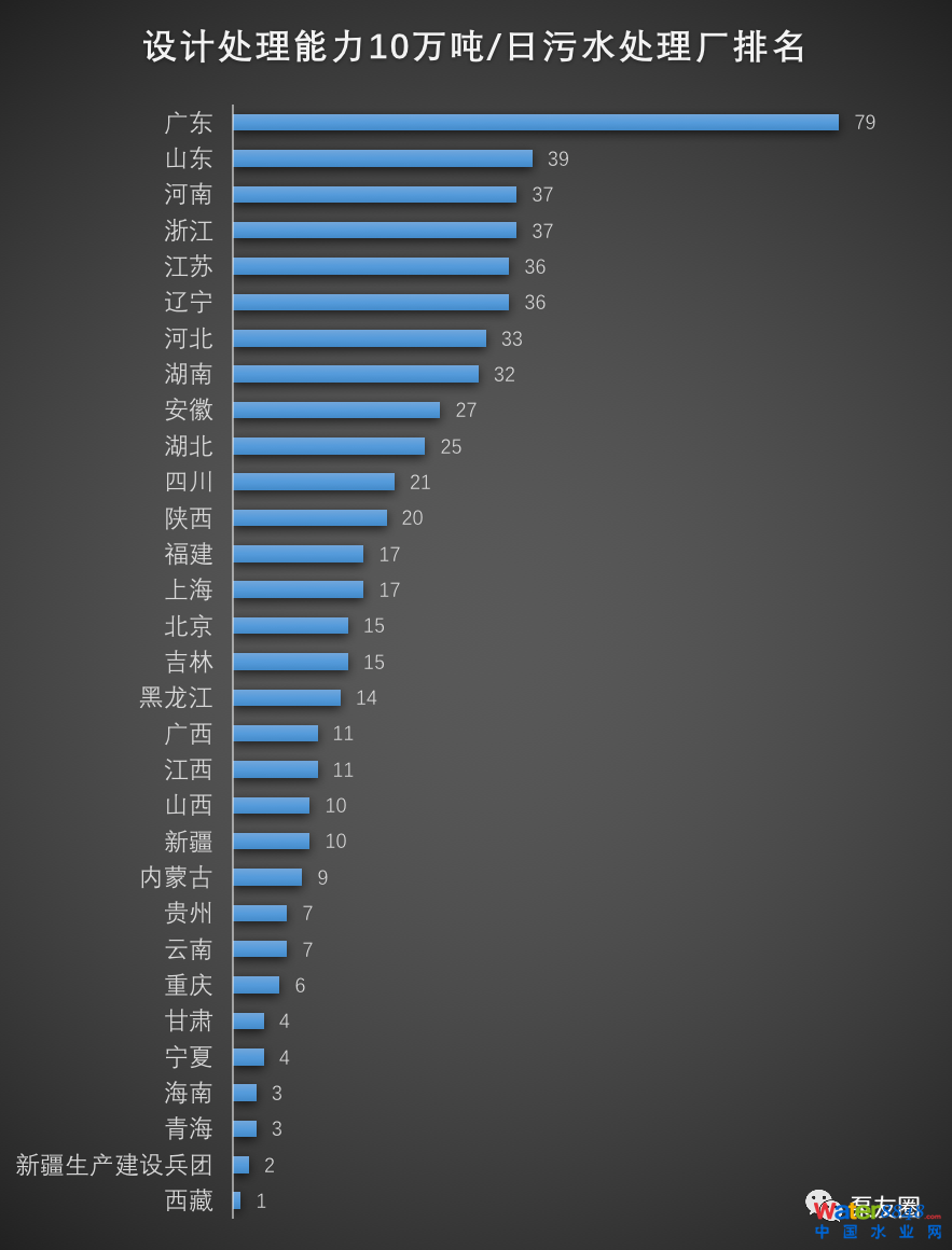 擁有設(shè)計(jì)處理能力為10萬噸/日的污水處理廠數(shù)量,第一名為廣東79座,第二名為山東39座,第三名為河南、浙江37座。