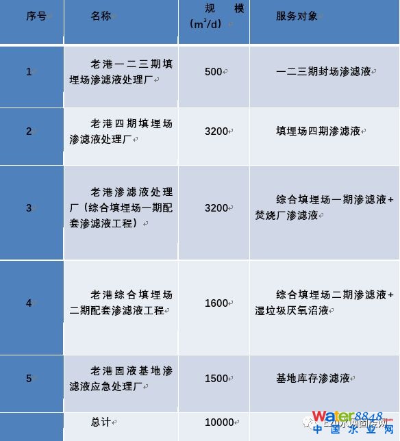 老港固廢基地中已建有五個滲濾液處理廠:老港一二三期填埋場滲濾液處理廠,規(guī)模為500噸/天,服務對象為一二三期封場滲濾液;老港四期填埋場滲濾液處理廠規(guī)模為3200 m3/天,服務對象為填埋場四期滲濾液;老港滲濾液處理廠(綜合填埋場一期配套滲濾液工程),服務于綜合填埋場一期的滲濾液以及焚燒廠的滲濾液,規(guī)模也是3200 m3/天。三座滲濾液處理廠已建成,并在穩(wěn)定運行中;刂械谒淖鶟B濾液處理廠為老港綜合填埋場二期配套滲濾液工程,服務對象是綜合填埋場二期的滲濾液以及老港濕垃圾厭氧發(fā)酵產(chǎn)生的沼液,規(guī)模是1600 m3/天。第五座滲濾液處理廠采取購買服務的方式,主要處理基地庫存滲濾液,規(guī)模為1500 m3/天。