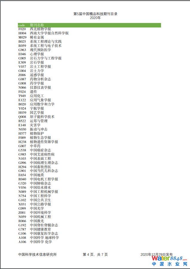 中國給水排水入選第5屆中國精品科技期刊目錄,全國共300種。