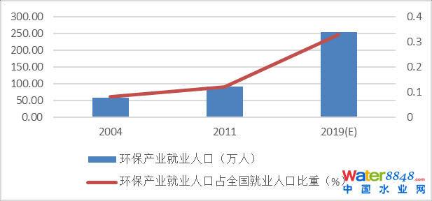 2004-2011年,我國環(huán)保產(chǎn)業(yè)從業(yè)人員年均增長率6.8%,2011-2019年年均增長率為13.6%。2019年環(huán)保產(chǎn)業(yè)從業(yè)人員占全國就業(yè)人員年末人數(shù)的0.33%,比2011年提高0.21個(gè)百分點(diǎn),比2004年提高0.25個(gè)百分點(diǎn),對(duì)全國就業(yè)的貢獻(xiàn)呈逐步擴(kuò)大的趨勢。
