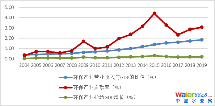 2004—2019年,我國環(huán)保產(chǎn)業(yè)營業(yè)收入與國內(nèi)生產(chǎn)總值(GDP)的比值從2004年的0.4%逐步擴(kuò)大到2019年的1.8%。環(huán)保產(chǎn)業(yè)對(duì)國民經(jīng)濟(jì)直接貢獻(xiàn)率從2004年的0.3%上升到2019年的3.1%,盡管期間出現(xiàn)過一些波動(dòng),但環(huán)保產(chǎn)業(yè)對(duì)國民經(jīng)濟(jì)的貢獻(xiàn)總體呈逐步加大的趨勢。