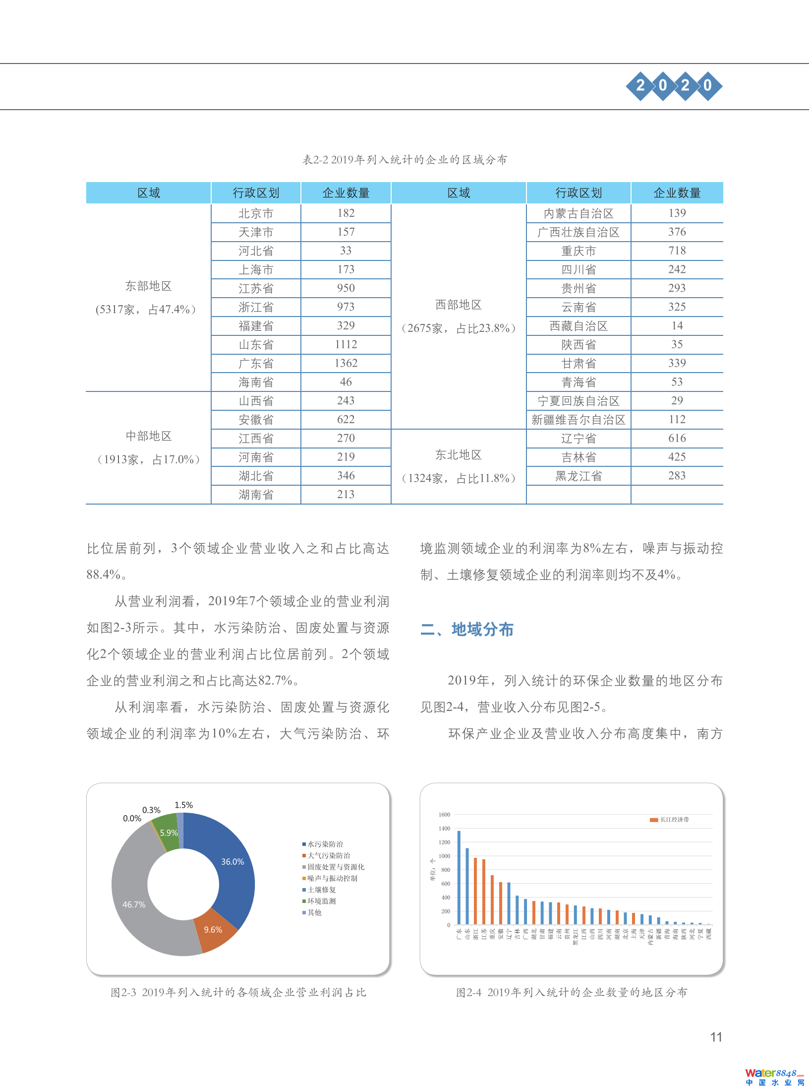 從地域分布看,統(tǒng)計(jì)范圍內(nèi)企業(yè)有近半數(shù)集聚于東部地區(qū),東部地區(qū)環(huán)保企業(yè)的營業(yè)收入、營業(yè)利潤占比分別為67.4%、67.6%,遠(yuǎn)遠(yuǎn)超過中、西部和東北三個(gè)地區(qū)企業(yè)的營業(yè)收入、營業(yè)利潤。長江經(jīng)濟(jì)帶11省(市)以45.6%的企業(yè)數(shù)量占比貢獻(xiàn)了近一半的產(chǎn)業(yè)營業(yè)收入,對(duì)我國環(huán)保產(chǎn)業(yè)發(fā)展支撐能力較強(qiáng)。