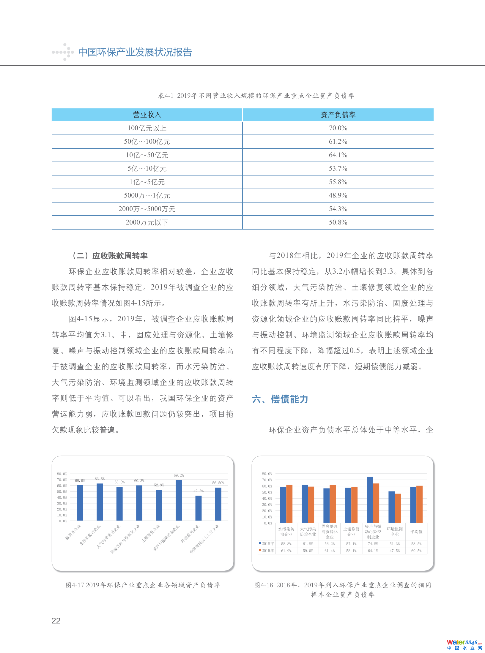 從資產(chǎn)營運(yùn)能力看,統(tǒng)計(jì)范圍內(nèi)企業(yè)總資產(chǎn)周轉(zhuǎn)率平均值為0.5、應(yīng)收賬款周轉(zhuǎn)率平均值為3.1,均較低,與2018年相比,2019年相同樣本企業(yè)的總資產(chǎn)周轉(zhuǎn)率、應(yīng)收賬款周轉(zhuǎn)率變動(dòng)幅度在0.1以內(nèi),反映環(huán)保企業(yè)的資產(chǎn)營運(yùn)能力基本保持穩(wěn)定,回款問題仍較突出。
