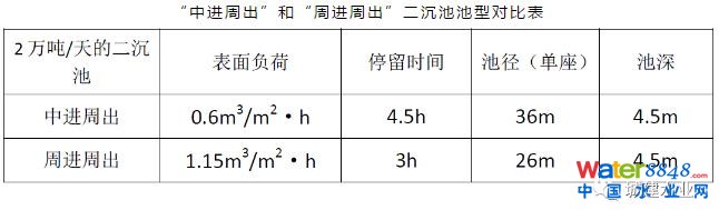 目前,城鎮(zhèn)污水處理廠常用的二沉池分為兩種池型:“中進(jìn)周出”和“周進(jìn)周出”,前者優(yōu)點(diǎn)是進(jìn)水端配水均勻,缺點(diǎn)是沉淀效果較差、負(fù)荷低、池子平面尺寸較大,后者的優(yōu)點(diǎn)是進(jìn)水負(fù)荷高、池子占地面積小,缺點(diǎn)是配水不均勻。從兩種池型的運(yùn)行情況來看,均能較好的滿足生化池后的泥水分離,但是本工程可用建設(shè)用地面積較小,因此占地面積小是本工程二沉池池型選擇的重點(diǎn)因素,因此,設(shè)計(jì)時(shí)選用“周進(jìn)周出”型二沉池。