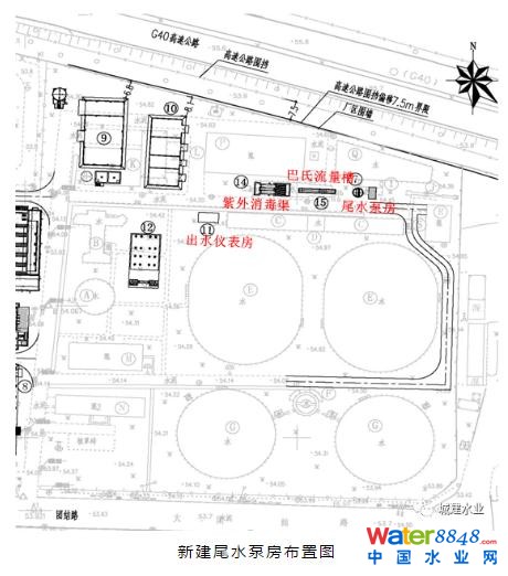 4、本工程需建設(shè)1座4.0萬噸/天的尾水泵房,布置在廠區(qū)水力流程尾端效果最佳,如此則管線無迂回,水頭損失小。原污水處理廠的建設(shè)缺乏系統(tǒng)性和規(guī)劃性,先后建設(shè)有絮凝+轉(zhuǎn)盤濾池、紫外消毒渠、巴氏流量槽、中水回用池、中水回用泵房和污泥干化棚等構(gòu)筑物(前三個(gè)為一期建設(shè)構(gòu)筑物,后三個(gè)為后期增建構(gòu)筑物)。本工程設(shè)計(jì)時(shí)將紫外消毒渠、巴氏流量槽向西平移至本次需拆除的絮凝+轉(zhuǎn)盤濾池(因膜通量下降,堵塞嚴(yán)重,出水SS超標(biāo)而廢除)處,在平移后的巴氏流量槽在后端建設(shè)尾水泵房,此布置方案(如下圖所示)工藝管線順暢、節(jié)省能耗。